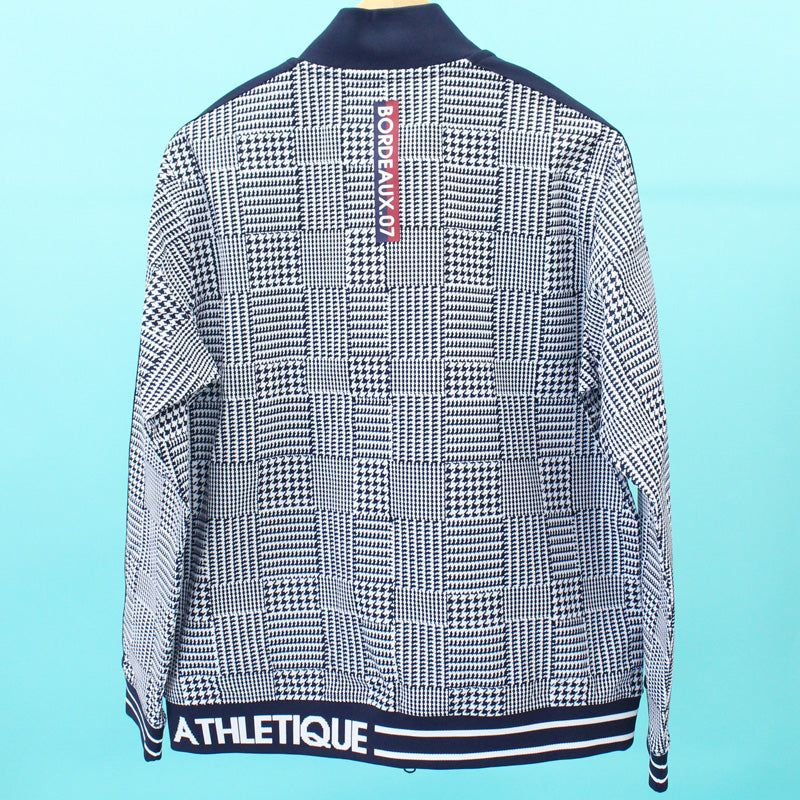 千鳥格子のストレッチフルジップアップニットブルゾン。