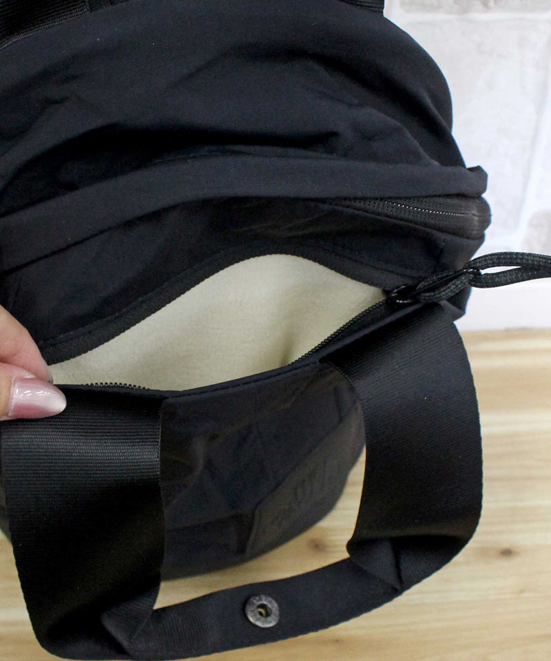ファスナー仕様のアウトポケットは、小型モバイルやサングラスの収納に役立つフリースライニングを採用。