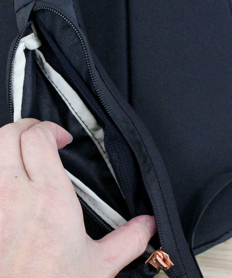 メインポケットは大きく開き扱いやすいWジップ仕様。